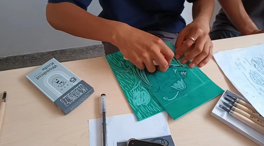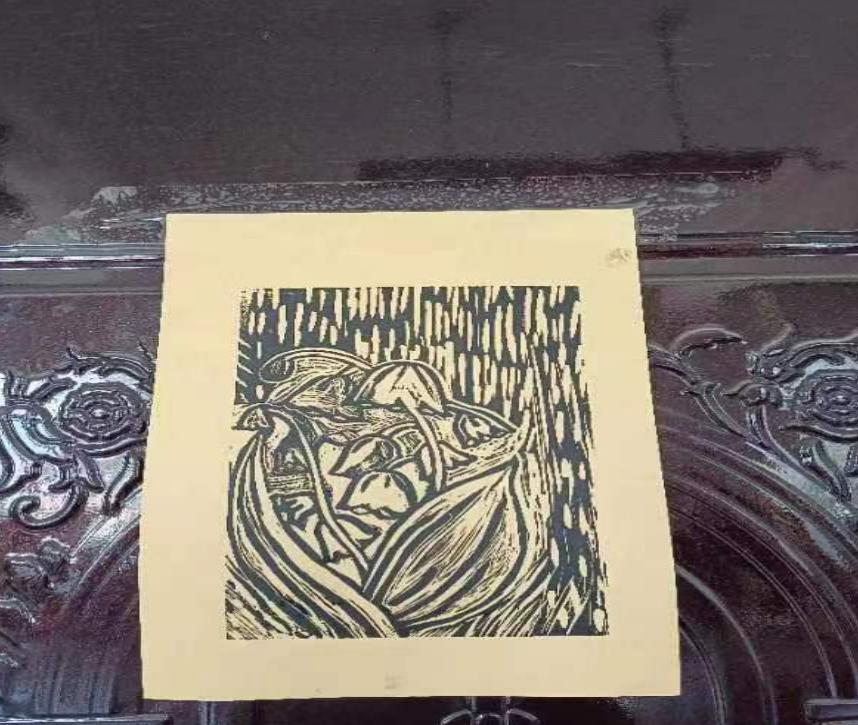 目光转向大礼堂外,有一群员工,静静的坐着,只是手上的刻刀发出沙沙的声响。此次美术的展示内容为版画,大家都在心无旁骛、有条不紊地进行创作。