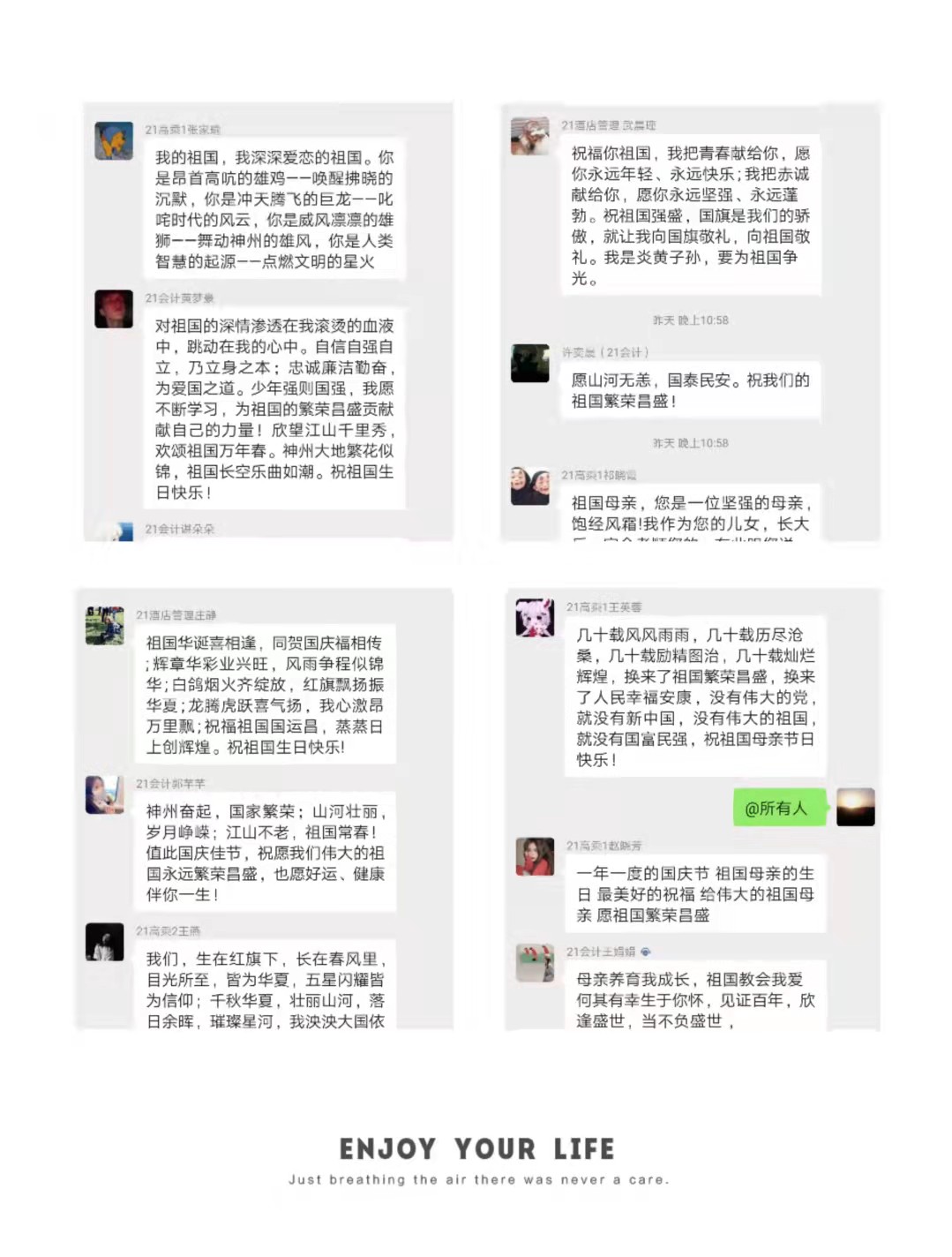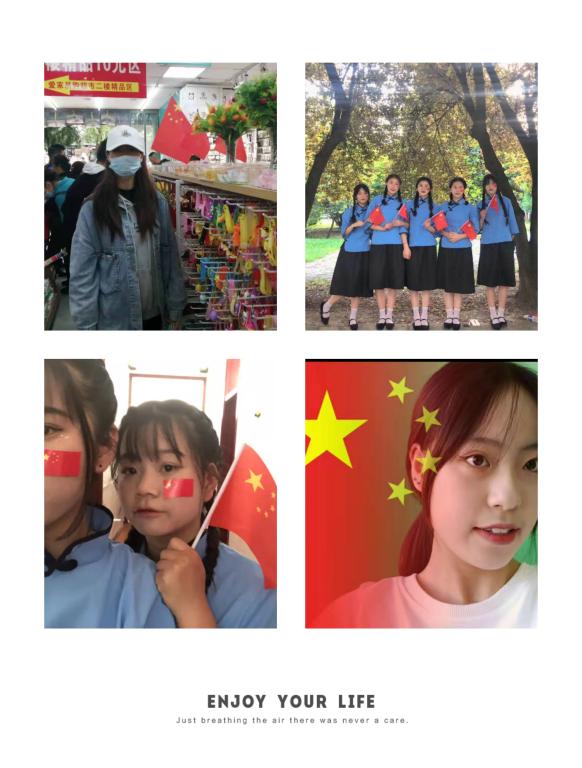同学们怀着激动的心情在不同场合与鲜艳的五星红旗合影留念。有的同学将小小的国旗贴在脸上,有的同学面对国旗庄严敬礼,有的同学用国旗装扮了宿舍等等,这一个个举动都表达了新时代老员工对祖国的热爱之情。