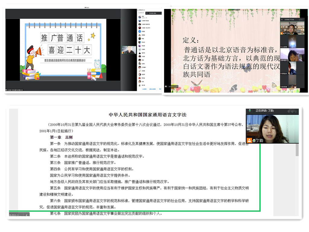 普通话与规范汉字是我们日常工作、学习、生活中最重要的语言交流工具,普通话与规范汉字的应用能力是我们社会实践活动的基本能力。学校是推广普通话的重要阵地,“说普通话,写规范字”的意识和能力,是新时代老员工自身素养的重要体现。为了响应国家推广普通话的号召,营造“说普通话、写规范字”的良好学习氛围,9月13日晚,bevictor伟德官网组织各班级召开了以“推广普通话,喜迎二十大”为主题的线上班会。