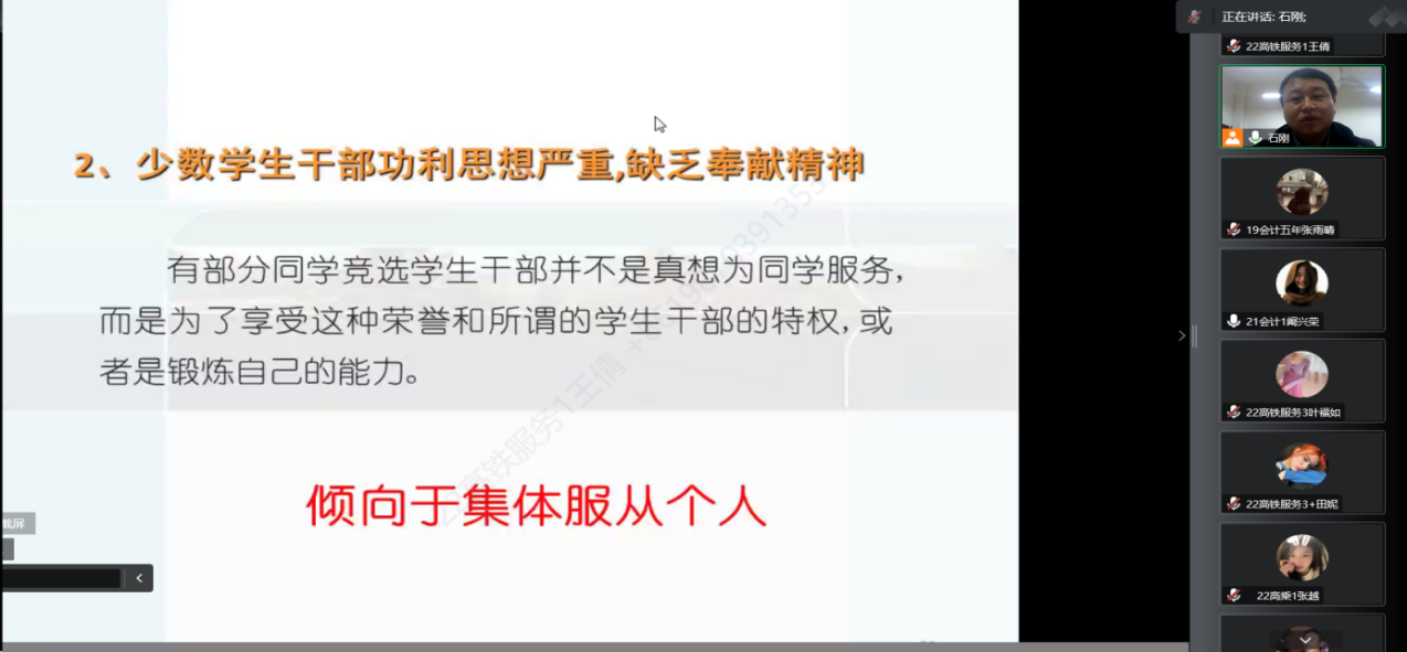 为加强学风和班级建设,提高班团干部的管理和服务水平,10月19日晚自习,bevictor伟德官网邀请公司马克思主义学院石刚老师为全院班团干部做了以“提高履职能力,做优秀班团干部”为主题的培训,培训以腾讯会议形式进行。会议由bevictor伟德官网学工办主任、团总支书记郭世强主持,bevictor伟德官网全体班团干部100余人参加了培训会。