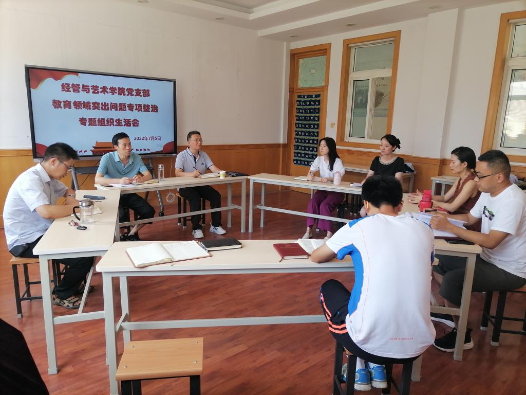 2022年7月5日下午经管与艺术公司党支部在二楼会议室召开教育领域突出问题专项整治专题组织生活会,支部全体党员参加,党委委员、纪委书记齐晓军到会指导并以普通党员身份参加了本次专题组织生活会,会议由党支部书记孟发军同志主持。