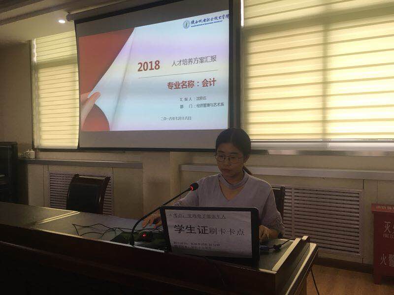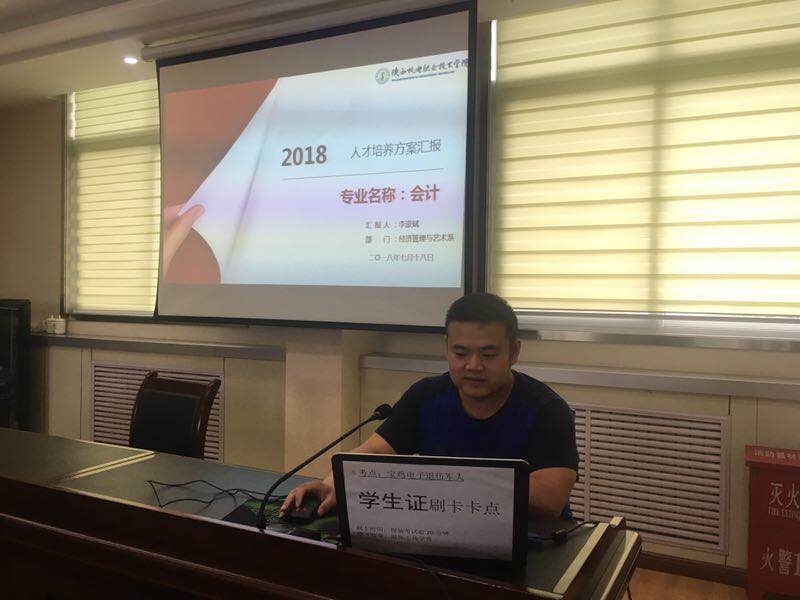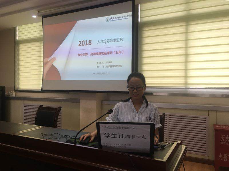 2018年7月18日,经济管理与艺术系的沈桂名、李豪斌、姚颖骏、严立琼参加了学院举办的《2018年人才培养方案》汇报和评审会议,分别进行了《会计》(三年)、《会计》(五年)、《高速铁路客运乘务》(三年)、《高速铁路客运乘务》(五年)的人才培养方案汇报,经过各位老师的辛勤工作,顺利完成了汇报工作。