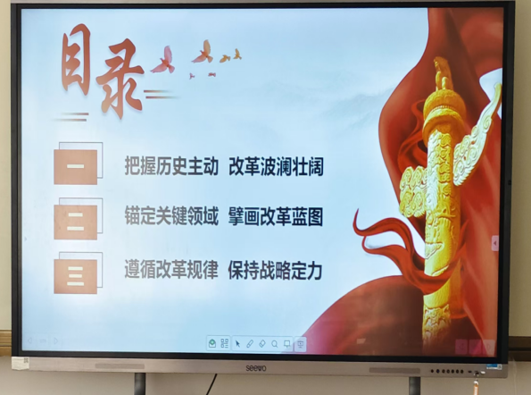 朱老师从“把握历史主动,改革波澜壮阔”“锚定关键领域、擘画改革蓝图”“遵循改革规律,保持战略定力”三方面深刻解读了党的二十届三中全会的精神要义和实践要求,结合改革开放以来党的历届三中全会,从历史、现实两个维度深入阐释了进一步全面深化改革的重要性和必要性,并结合实际例子全面深入细致的解读了进一步全面深化改革、推进中国式现代化的重大意义和总体要求,还深刻解读了全会明确的“七个聚焦”的改革目标、“六个坚持”的重大原则、“十五个方面”的重要部署。