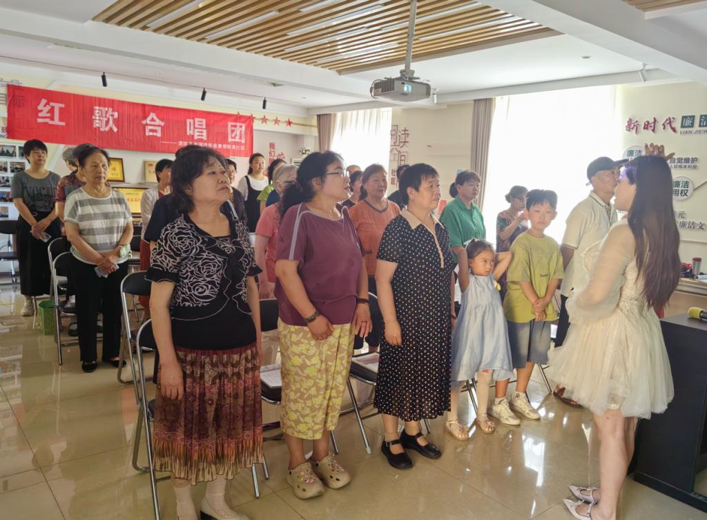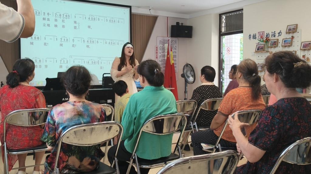实践团队以音乐为纽带,文老师作为声乐教师教授红歌。志愿者与老人们共同学习经典红歌、钢琴弹唱《绒花》引发全场共鸣,现场气氛热烈,老人学习认真。