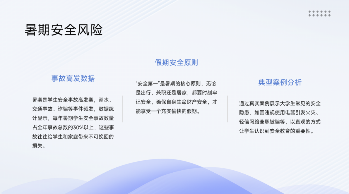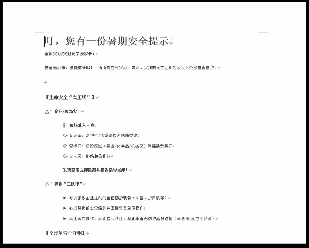 聚焦防溺水,家校联动强警示。针对暑期溺水事故、实习风险高发态势,学院构建“高频次、全覆盖”防溺水及实习安全宣传矩阵。除主题班会重点宣讲外,班主任持续通过班级群推送警示信息,并着重提醒家长及时与员工、老师沟通,切实履行暑期监护责任,做好家校联动,严防员工“离校即失管”。班会内容清晰划定风险区域——池塘、水库、河湖、蓄水坑等均属需远离的“重点危险水域”,明确要求全体员工:主动劝阻同伴靠近危险水域,坚决抵制无安全保障措施水域的戏水、野泳行为,全面提升风险预判与自我防护能力。