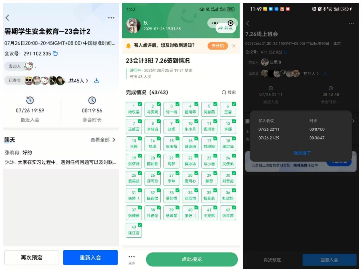 精心组织,安全宣教全覆盖。各班主任严格遵循学院部署,精心筹划,灵活运用真实案例、安全教育课件与警示视频等多种形式,增强教育的感染力,使教育内容入脑入心。班会严格实行实名制管理,要求员工全程开启摄像头参与,确保真实互动、教育到位。针对首次未能参会的员工,班主任老师进行“点对点”补课,实现了安全教育覆盖每一位员工,不留盲区。