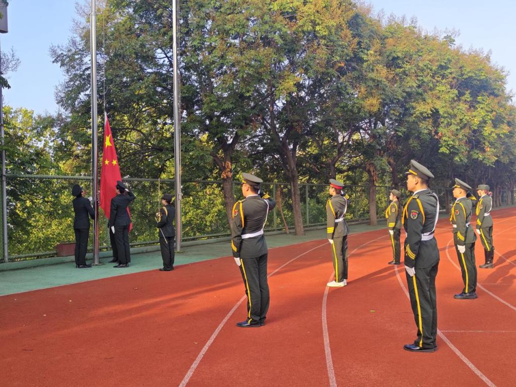 清晨7时50分,伴随着朝阳初升,国旗护卫队队员身着挺拔制服,迈着铿锵有力的步伐,护送五星红旗走向旗杆。全场师生肃立注目,在激昂雄壮的《义勇军进行曲》中,五星红旗冉冉升起、迎风飘扬,每一颗心都与祖国的脉搏同频共振,现场庄严而肃穆的氛围,让爱国情怀在每个人心中深深扎根。