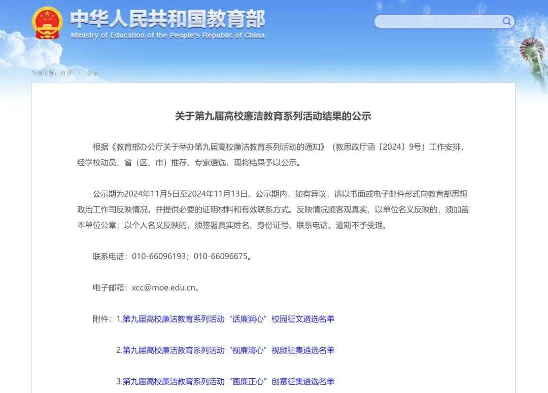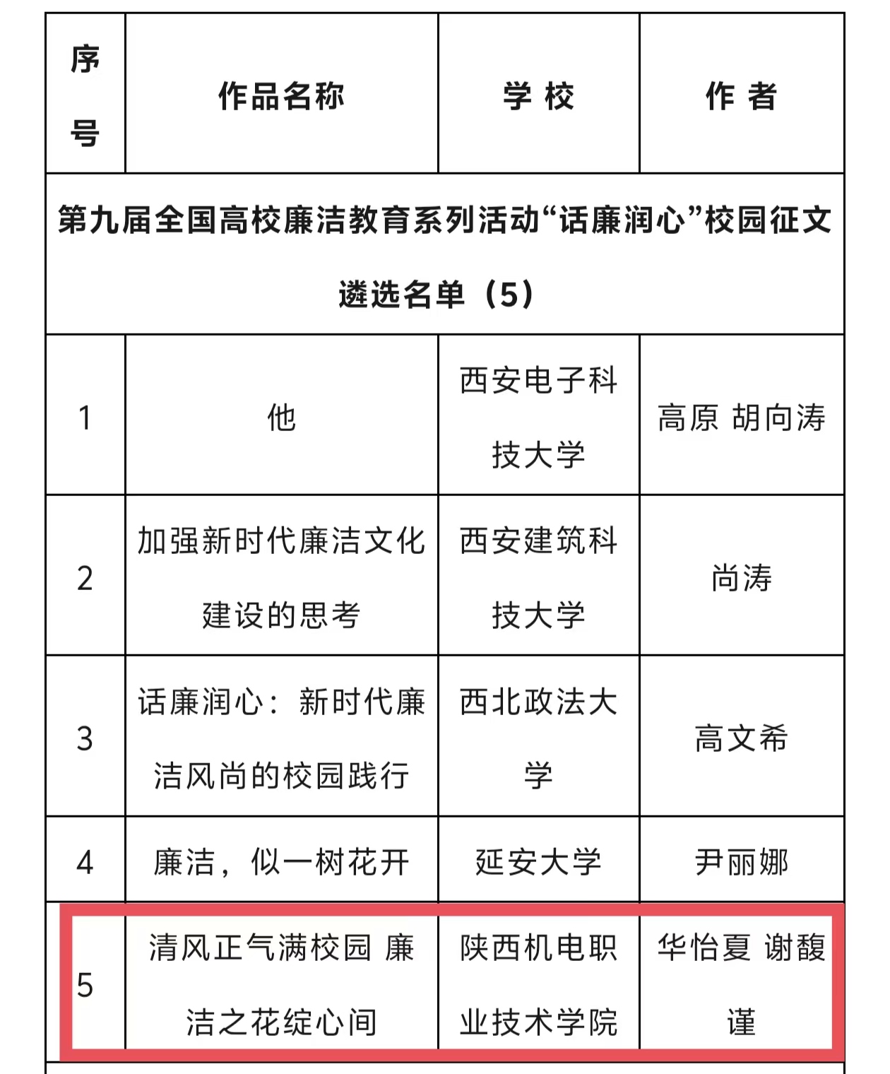 近日,第九届全国高校廉洁教育系列活动“话廉润心”校园征文遴选名单公布,23高铁服务2班员工谢馥谨撰写的《清风正气满校园 廉洁之花绽心间》名列其中,且为唯一一篇陕西高职院校获此殊荣的征文,向谢馥谨同学表示祝贺!