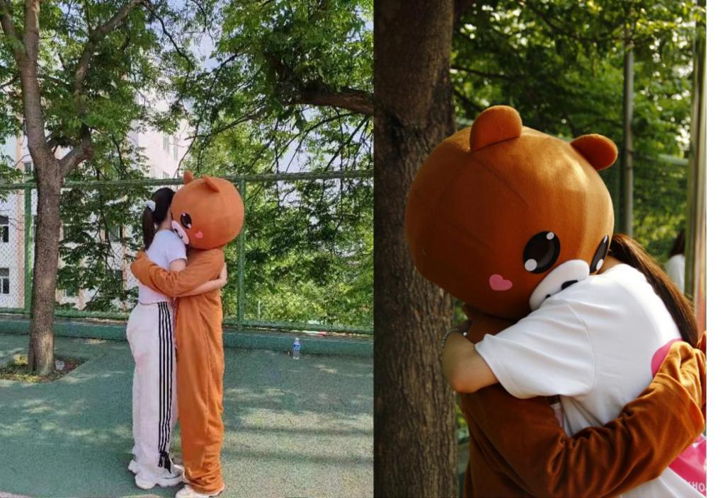 校园的主干道、羽毛球馆、操场等各个角落都有小熊人偶遇的身影。